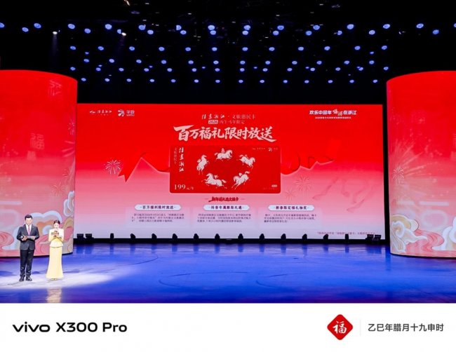 此次开幕式得到多方力量鼎力支持:vivo 深度参与文旅推广,不仅推出 “一起出发趣浙江” 夏日毕业季活动,更联动长三角高校的校园大使共建 “诗画浙江” 校园推广矩阵,同时将在手机中系统级推送 “诗画浙江” 新春壁纸;京东物流、杭州肯德基有限公司、万达广场、飞猪、携程等知名企业全程助力,宁波银行、交通银行、建设银行、浙商银行等多家银行同步提供优惠折扣福利。此外,开幕式还官宣了商圈、赛事、住宿、餐饮、景区等多领域惠民举措,配套发放多种消费券,并发布详细的文化旅游打卡指南,全方位激活浙江新春文旅消费活力。